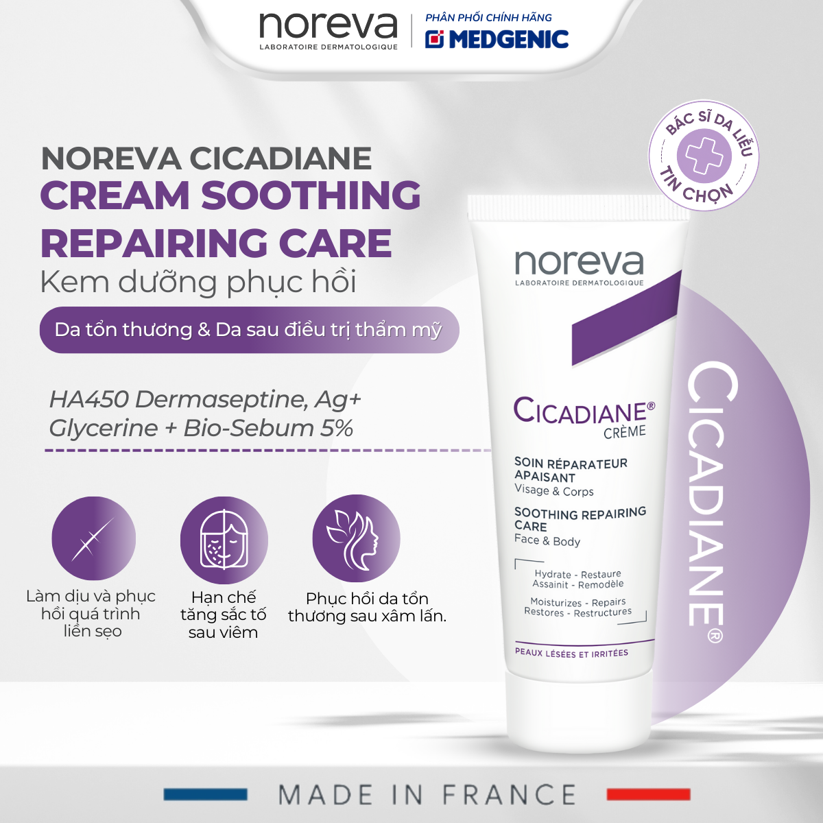 Noreva Cicadiane Cream Soothing Repairing Care là kem phục hồi da chuyên sâu dành cho mọi loại da yếu, nhạy cảm hoặc bị tổn thương do kích ứng, nắng gắt hay tác động bên ngoài.