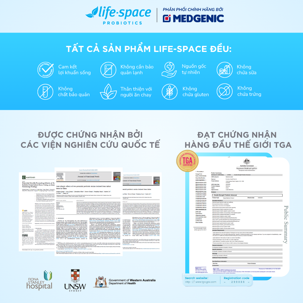 Life-Space Double Strength Probiotic 60 Viên là phiên bản nâng cao của dòng sản phẩm Life-Space, được thiết kế với 15 chủng lợi khuẩn đa dạng và hàm lượng cao hơn để hỗ trợ tiêu hoá hiệu quả, cân bằng hệ vi sinh vật đường ruột và tăng cường sức khỏe tổng thể. Sản phẩm đặc biệt phù hợp cho những người cần phục hồi nhanh chóng sau các rối loạn tiêu hoá, trong giai đoạn căng thẳng, khi thay đổi chế độ ăn hoặc sử dụng kháng sinh. Đồng thời, viên probiotic này không yêu cầu bảo quản lạnh, thuận tiện cho việc sử dụng hằng ngày và an toàn cho người ăn chay. Đây là giải pháp tối ưu giúp duy trì sức khỏe đường ruột ổn định và nâng cao khả năng miễn dịch tự nhiên.